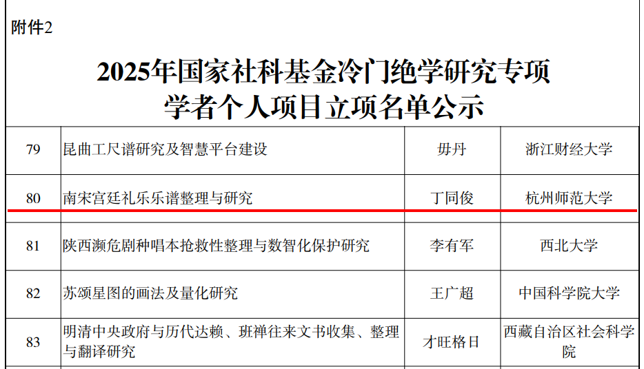 此次公布的2025年国家社科基金冷门绝学研究专项共有130项课题入选,其中学术团队项目36项,学者个人项目94项。我院《南宋宫廷礼乐乐谱整理与研究》的成功立项,不仅是对丁同俊老师多年深耕南宋音乐史的学术肯定,更是对我院在传统音乐文化研究领域深厚积淀的有力见证,也为杭州市深挖地方文化底蕴,打造文化品质之城添上一道亮丽的色彩。